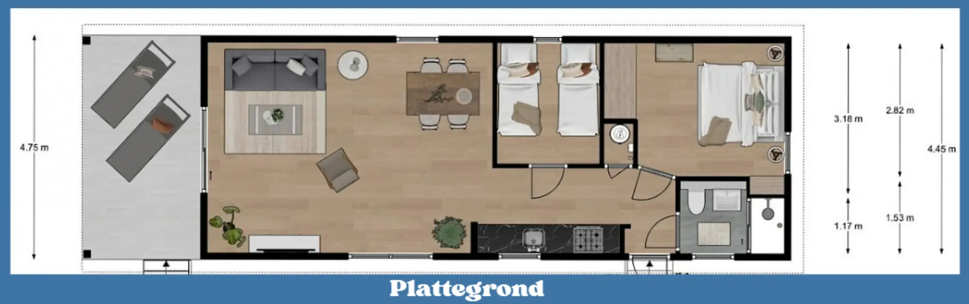 - Het huisje ligt op ’n kleinschalig park waar rust belangrijk is. Daarom wordt het niet verhuurd aan vriendengroepen.